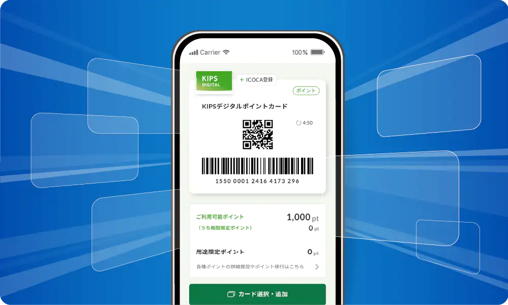 お財布からカードを取り出すことなく、KIPSポイントをためたり、つかったり、クレジットカード決済もラクラク!さらに、近鉄クレジットカード(外商カード)、近鉄友の会会員証カードもご登録いただけます。